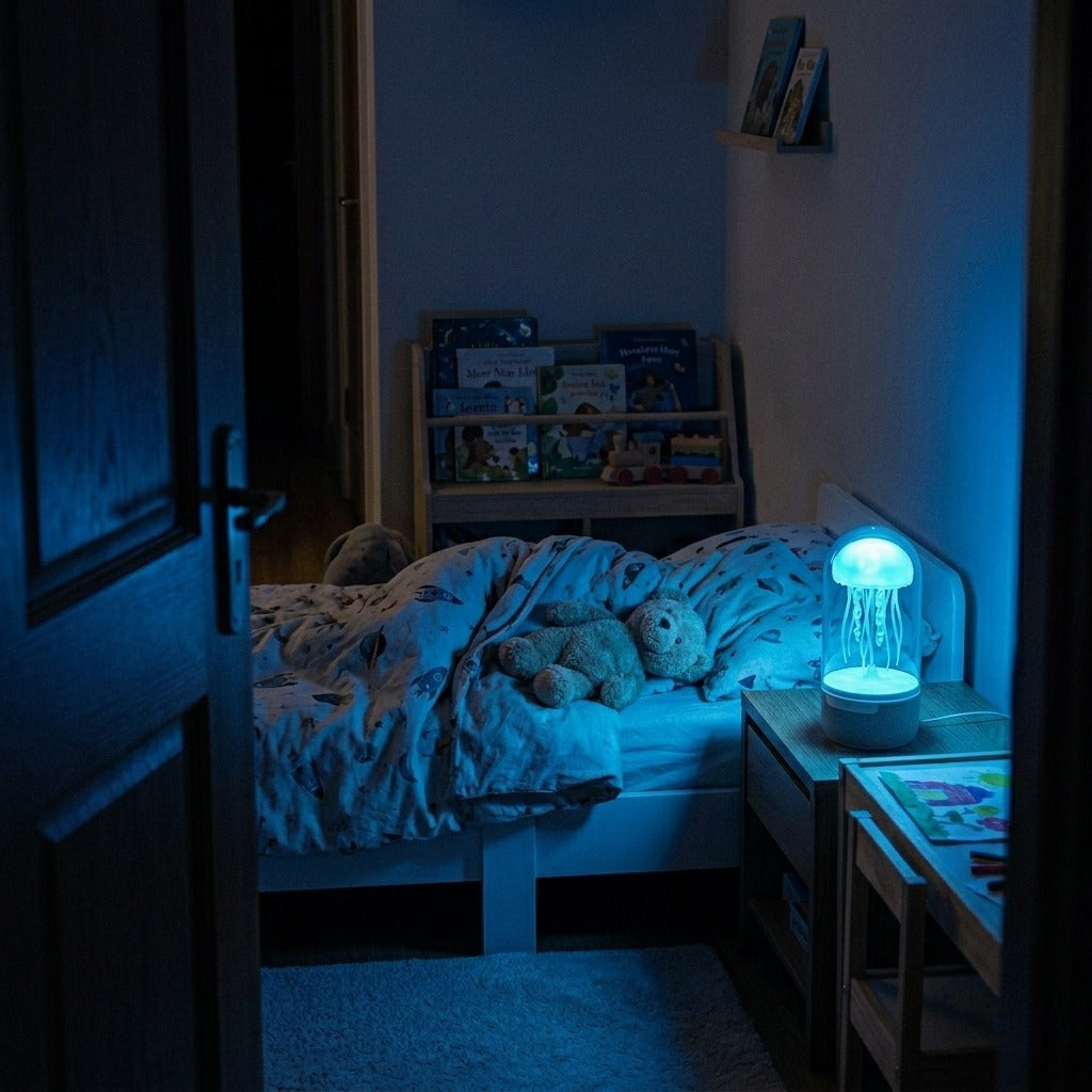 A mis peques les encanta el movimiento de la medusa. La luz es suave y no les molesta para dormir. Además, les pongo audiolibros.
